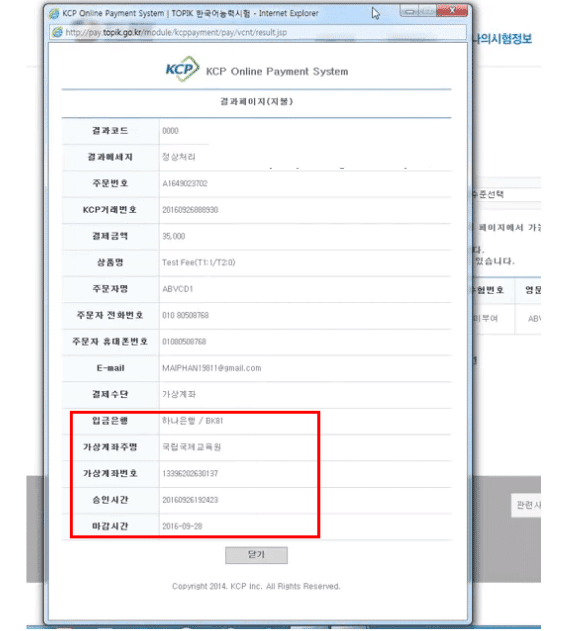 Sau đó bạn sẽ tiếp tục điền đầy đủ thông tin của bản thân để tạo tài khoản ảo nộp phí dự thi. Cuối cùng, bạn sẽ chuyển tiền phí đăng ký thi TOPIK vào tài khoản được cung cấp như ảnh bên dưới là hoàn thành nha.